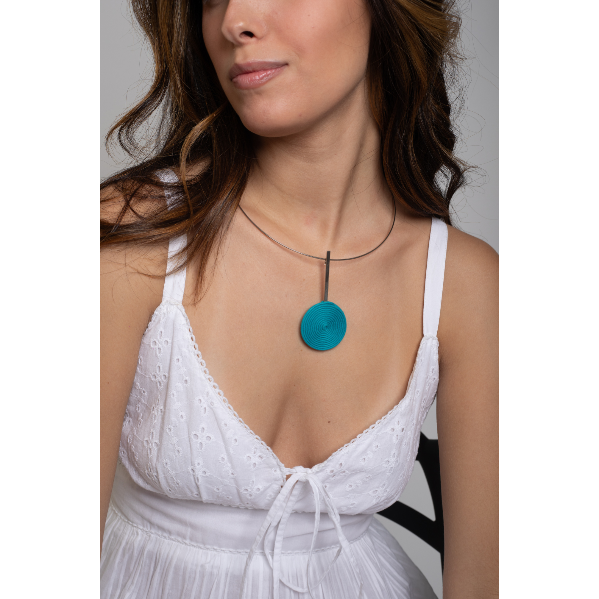 Colar Artesanal em Metal e Fios de Algodão Sustentável Azul Tuquesa