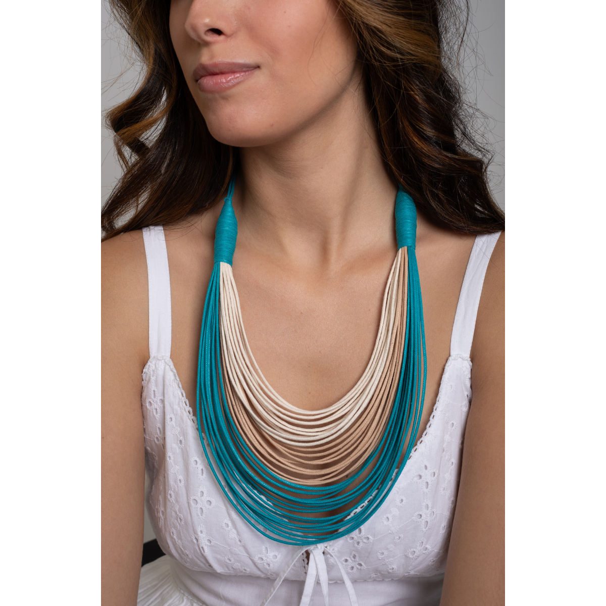 O Colar Artesanal em Fios de Algodão Sustentável Tricolor é a escolha perfeita para quem busca um acessório sofisticado e eco-friendly. Feito à mão por mulheres artesãs, este colar utiliza fios de algodão 100% sustentável nas cores azul turquesa, bege e off white, trazendo a beleza e o conceito de moda consciente. Cada peça carrega o propósito de promover o uso responsável de materiais extraídos da natureza, tornando o Colar Artesanal em Fios de Algodão Sustentável Tricolor ideal para quem deseja unir estilo com sustentabilidade.