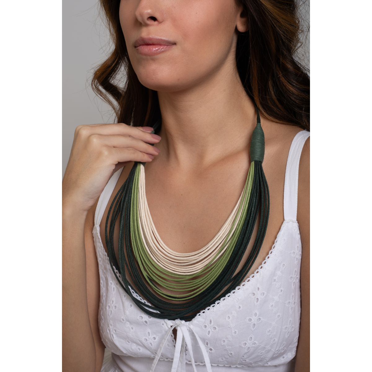 O Colar Artesanal em Fios de Algodão Sustentável Tricolor combina estilo e consciência ambiental em uma peça única. Feito à mão com fios de algodão 100% sustentável nas cores verde escuro, verde alface e off white, este colar destaca a beleza natural dos materiais ecológicos. Criado por artesãs talentosas, ele reflete o cuidado e o uso consciente de recursos naturais, promovendo o consumo responsável e sustentável. O Colar Artesanal em Fios de Algodão Sustentável Tricolor é perfeito para quem busca acessórios que alinham estilo moderno e respeito ao meio ambiente.