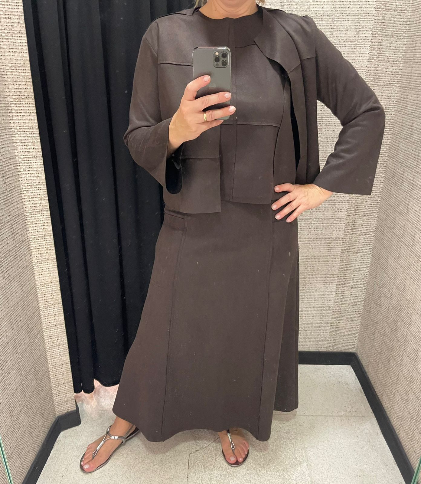 Conjunto de Saia, Regata e Casaco com Pespontos aparente Chocolate